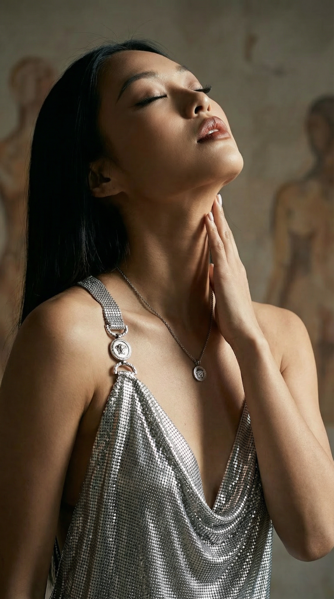 “Liquid silver, iconic Versace, unapologetic glamour.”